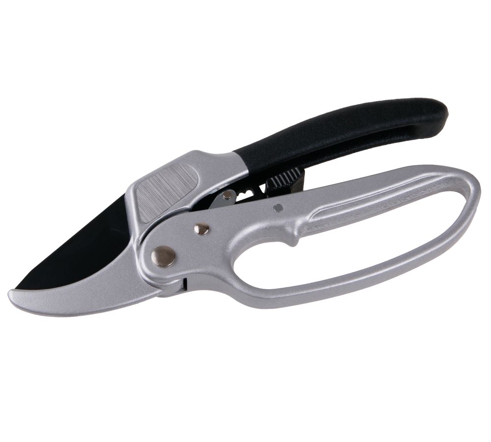 Profesionální zahradnické nůžky do jedné ruky s hliníkovou, pogumovanou rukojetí a rohatkou. Nůžky jsou opatřeny vysoce kvalitní čepelí vyrobené z japonské oceli. Rohatkový převod pro krokové stříhání zajistí vynaložení menší síly při stříhání větších větví. Ergonomicky tvarovaná, pogumovaná rukojeť z hliníkové slitiny má ideální tvar i pro dlouhodobou práci. Nůžky jsou navíc opatřeny tlačnou pružinou, která nůžky rozevírá. Samozřejmostí je pojistka proti samovolnému rozevírání. Celková délka:205 mmDélka břitu:45 mmMax. průměr střihu:24 mmMateriál čepele:HCS SK-5 - japonská ocelPovrch. úprava čepele:teflonMateriál rukojetí:hliník + TPR gumaExtra:rohatka, pružina, pojistka