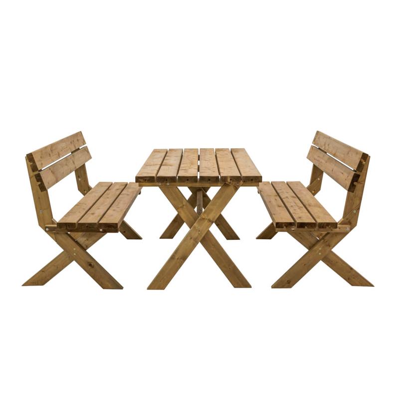 Zahradní sedací set PARTY vyrobený ze severské borovice. Chcete-li sdílet svůj čas s rodinou nebo přáteli v srdci vaší zahrady nebo na terase, je tato sestava tou pravou volbou. Pro delší životnost je produkt tlakově impregnován - hnědou tlakovou impregnací Sestava disponuje certifikátem FSC®. Specifikace: Dřevina: borovice Povrch: hnědá tlaková impregnace Typ: pevný Sestava: 1 stůl + 2 lavice Rozměry stolu v/š/hl: 740 x 750 x 1490 mm Rozměry lavice v/š/hl: 890 x 660 x 1490 mm Hmotnost: 115 kg Severská borovice je jednou z nejčastěji užívaných evropských dřevin na výrobu nábytku. Je zárukou trvanlivosti, ale i krásného vzhledu produktů. Díky svým vlastnostem je využívaná na výrobu moderních prvků, ale i nábytku v klasickém designu. V případě, že je pro prodloužení životnosti použita tlaková impregnace, získáte výrobek s dlouhou životností. V nové kolekci zahradního nábytku je severská borovice využita jak v čistě neupravené podobě (vhodná na další ošetření olejem), s ochranným olejovým nátěrem, tak i se zmíněnou tlakovou impregnací. Hustota dřeva 550 kg/m3. Dřevo je přírodní materiál, jeho kresba a zbarvení je na každém kusu nábytku unikátní. Nábytek je vyráběn tak, aby byl vhodný pro použití ve středoevropských podmínkách, přesto je nutné o něj pečovat a udržovat jej.