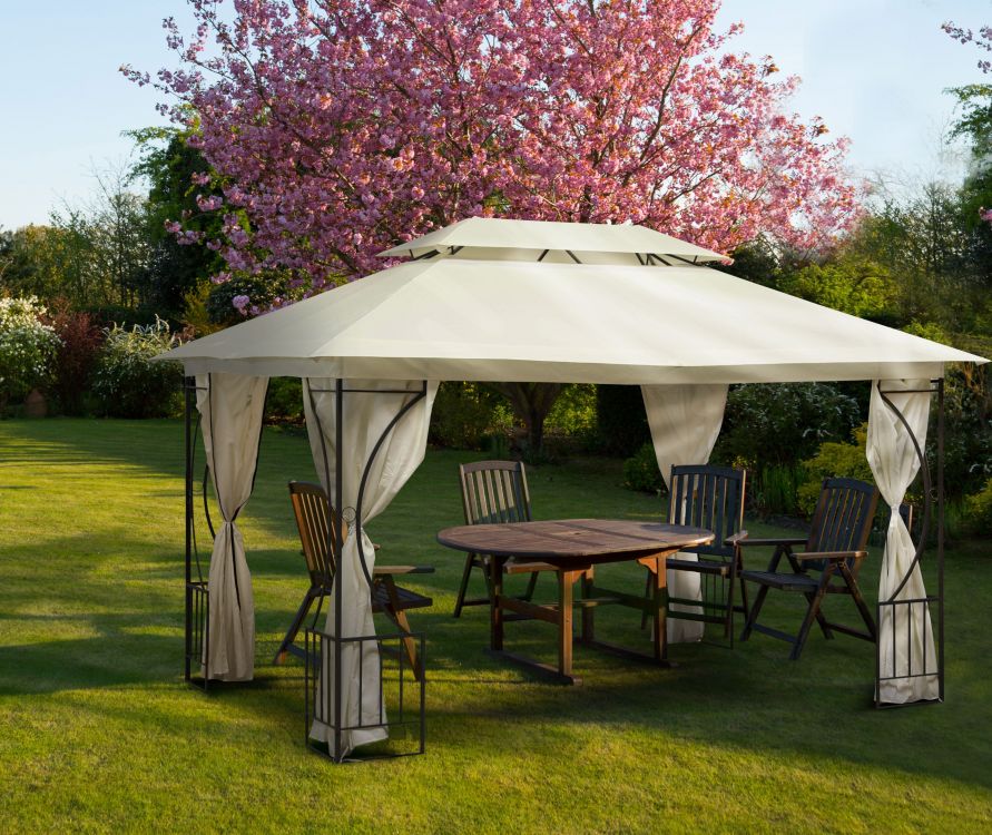 Pavilon má stabilní konstrukci, dvojitá střecha zajišťuje velmi dobrou ventilaci vzduchu v teplých dnech. Díky svému elegantnímu vzhledu a odolnému pevnému materiálu se bude dobře hodit nejen na domácí zahrádku, ale i do gastrozahrádek. V horní části střechy je speciální otvor, který zajišťuje správné odvětrávání uvnitř stanu, takže mimo zastíněné místo ucítíte příjemný vánek letního větru. Střecha je vyrobena ze speciálního voděodolného materiálu, který při dešti funguje jako deštník. Kapky deště volně stékají ze střechy pavilonu a nepronikají dovnitř. Konstrukce pavilonu je vyrobena z oceli s práškovým nástřikem, díky čemuž je odolný proti poškrábání a dlouho si zachovává perfektní vzhled. Střecha a stěny jsou vyrobeny z odolné polyesterové tkaniny odolné vůči povětrnostním vlivům (160 g/m²) v elegantní béžové barvě. Specifikace: Barva: béžová Rozměry střechy: 300 x 400 cm Rozměry rámu: 265 x 365 cm Výška: 197 - 270 cm Rám: ocel s práškovým nástřikem, tloušťka: 14x20 mm Střešní a boční panely: polyetylen Stabilní konstrukce Dekorativní rám dodávající jedinečný charakter Materiál je odolný vůči dešti a slunečnímu záření