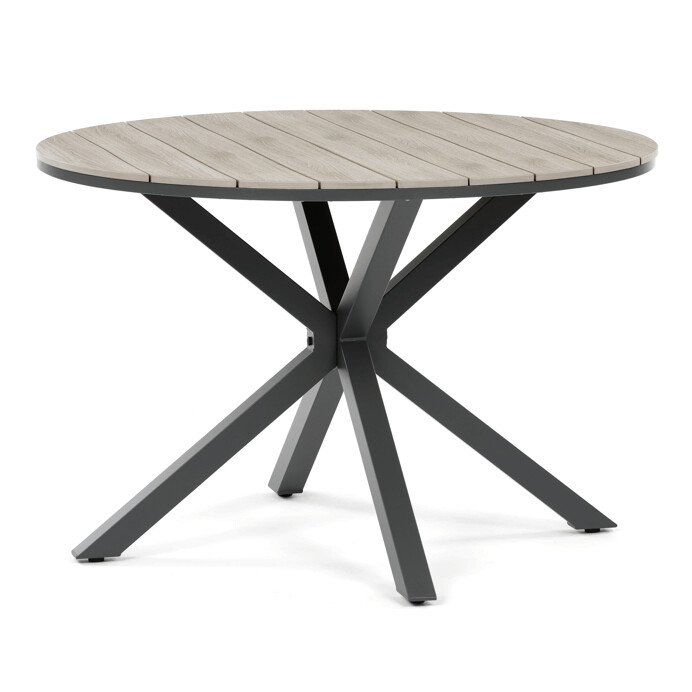 Zahradní stůl o rozměrech 110x75 cm kombinuje pevný šedý hliníkový rám s odolnou deskou z polywoodu v dekoru divokého dubu, která věrně napodobuje přírodní dřevo. Konstrukce stolu je navržena pro dlouhou životnost a snadnou údržbu, přičemž hliník zajišťuje stabilitu a odolnost vůči povětrnostním vlivům. Kulatý tvar desky podporuje pohodlné posezení a umožňuje snadnou komunikaci mezi uživateli. Díky nadčasovému designu se hodí do různých venkovních prostor, od teras po zahrady. Stůl je ideální volbou pro relaxaci i společenská setkání pod širým nebem.