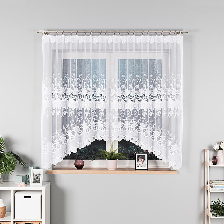 Hotová neboli kusová záclona střižená přesně na míru se začištěnými okraji pro okamžité použití. Tuto záclonu není třeba nijak upravovat, stačí ji jenom rozbalit a pověsit na žabky.