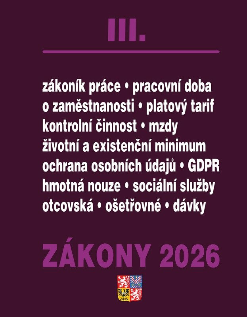 Zákony III obsahují právní předpisy pro oblast zákoníku práce, mzdových a platových předpisů, zaměstnanosti, pojištění, veřejného zdraví. Všechny právní předpisy obsahují novely zákonů schválených během roku 2025 k právnímu stavu 1. 1. 2026.