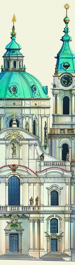 Papírová záložka do knihy s motivem kostelu sv. Mikuláše na Malé Straně.