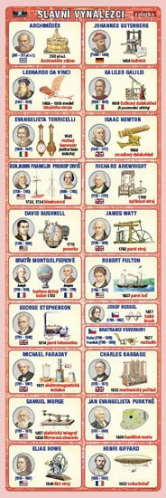 <p>Záložka obsahuje 47 slavných vynálezců včetně jejich portrétů a zobrazení jejich nejvýznamnějších vynálezů. Pro úplnost nechybí data vynálezů, národnost a data narození a úmrtí vynálezců.</p>