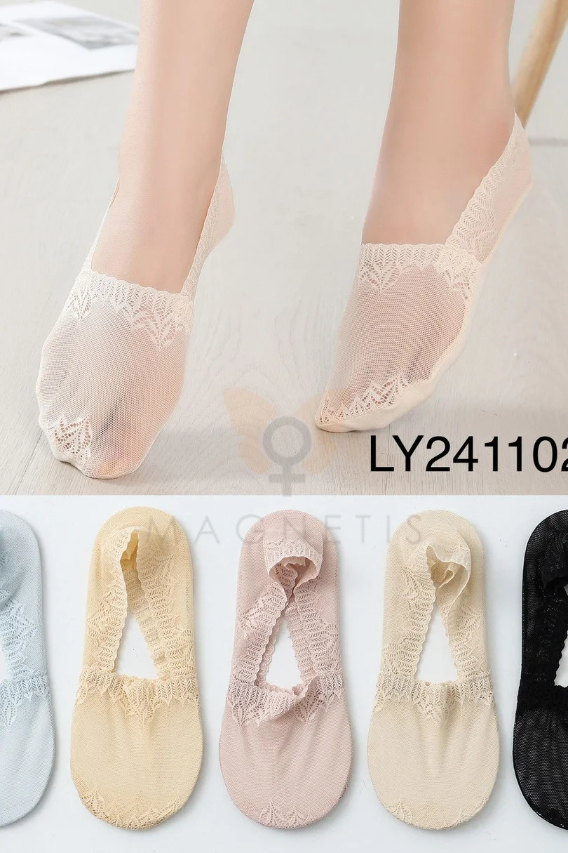 Ponožky Magnetis LY241102 jsou elegantní a mimořádně jemné ponožky z jemné síťoviny s krajkovým lemem. Jejich vzdušná struktura zajišťuje pohodlí při celodenním nošení a pružný materiál se dokonale přizpůsobí chodidlu. K dostání jsou v široké škále pastelových i klasických barevó>hodí se k balerínám, mokasínám i elegantním botám..