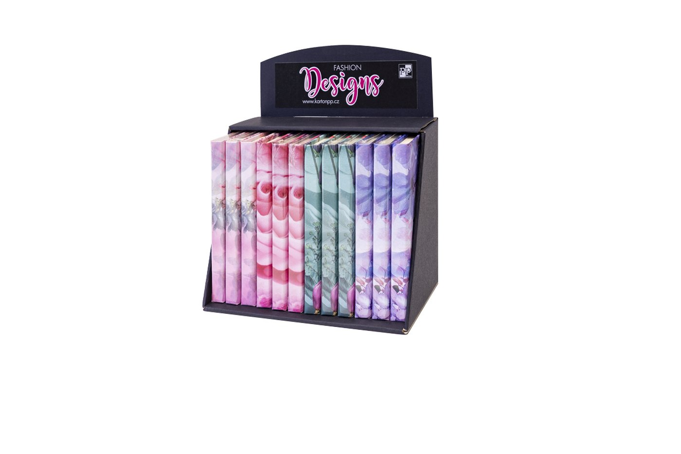 Zápisník s pevnými deskami, síla 2mm, 96 listů linka. Uzavírání doplněno plochou pruženkou. Pěkný moderní motiv potisku. Mix designů. Formát A6