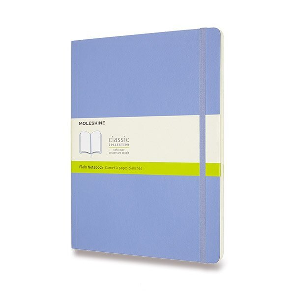Modrý čistý XL zápisník v měkké vazbě. Obepíná ho pružná páska proti samovolnému otevírání. Každý zápisník je vybaven pořadačem poznámek, který je vyroben z tkaniny a kartonu, textilní záložkou a letákem s historií Moleskine. Papír s gramáží 70 g/m2 neobsahuje kyseliny.