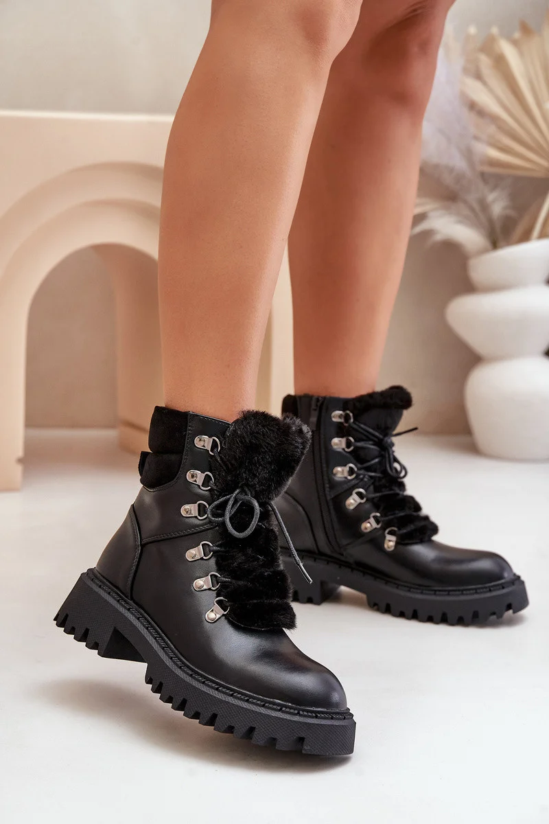 Dámské trapery vyrobené z eko kůže jsou skvělou volbou na chladnější dny. Model se šněrováním a zapínáním na zip, což usnadňuje rychlé obouvání a zajišťuje ideální přizpůsobení. Jazyk boty je ozdoben měkkým kožíškem, který přidává na půvabu a chrání před chladem. Vnitřní zateplení zajišťuje teplo a pohodlí při nošení, díky čemuž se trapery skvěle hodí jak na každodenní nošení, tak i do náročnějších povětrnostních podmínek. Při výběru velikosti se prosím řiďte tabulkou velikostí. 36-23,5/37-24/38-24,5/39-25/40-25,5/41-26cm