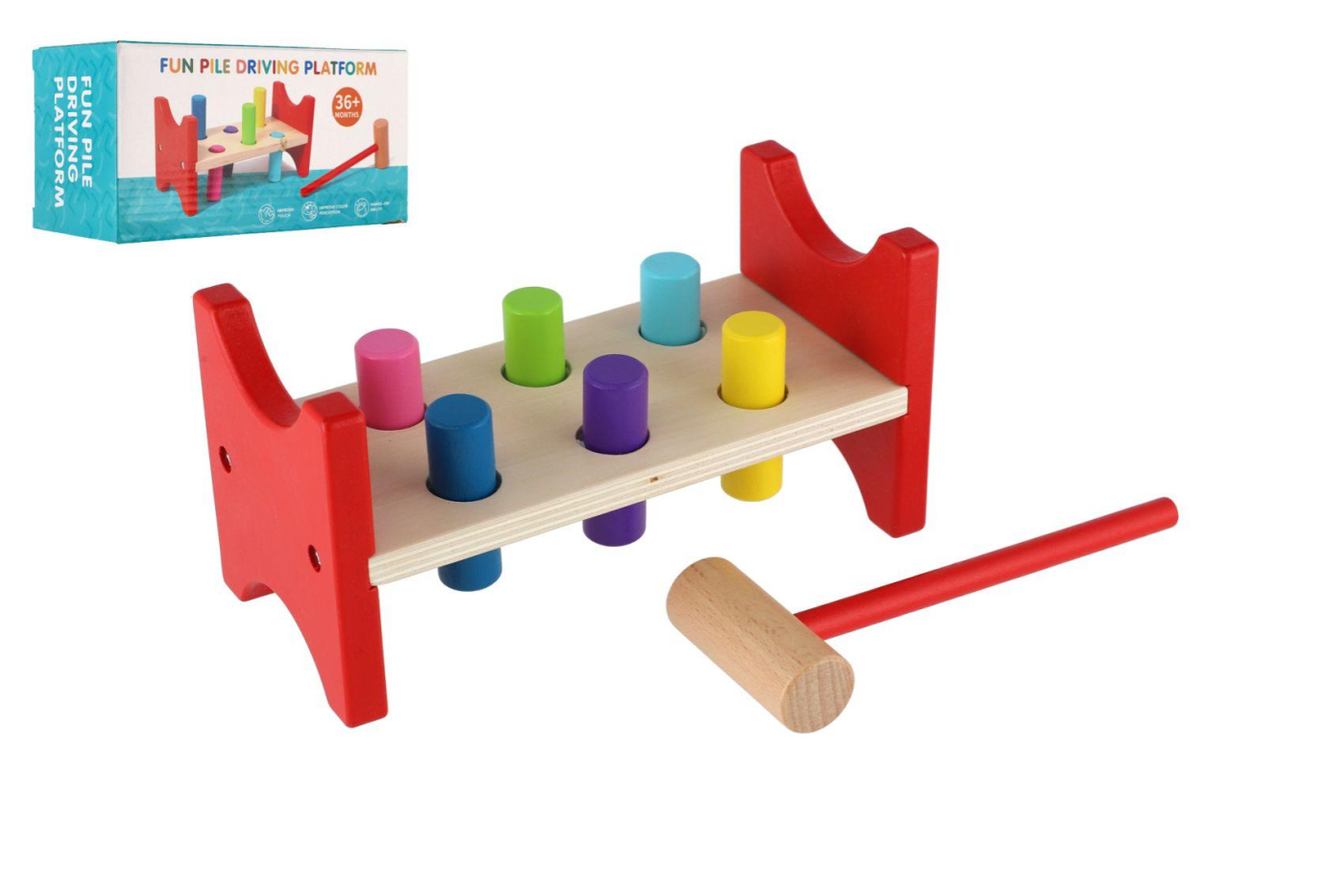 Klasická dřevěná zatloukačka s barevnými kolíčky a pevným kladívkem přináší dětem spoustu zábavy a zároveň rozvíjí jejich motoriku, koordinaci ruky a oka i sílu úchopu. Skvělá volba pro první „pracovní“ hru malých řemeslníků. Rozměr balení: 20 × 10 × 9,5 cm Vhodné pro děti od 18 měsíců