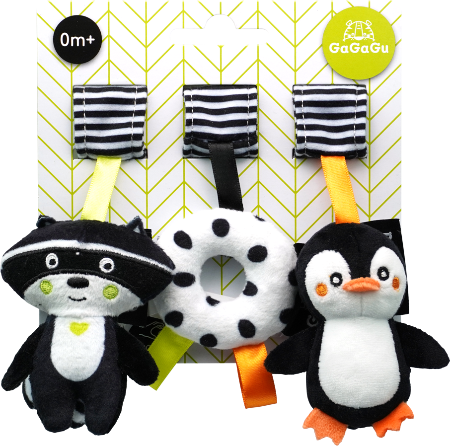Plyšové hračky jsou odnímatelné – lze je jednotlivě připevnit na kočárek nebo na jiné produkty z kolekce (např. hrací podložka Panda)
