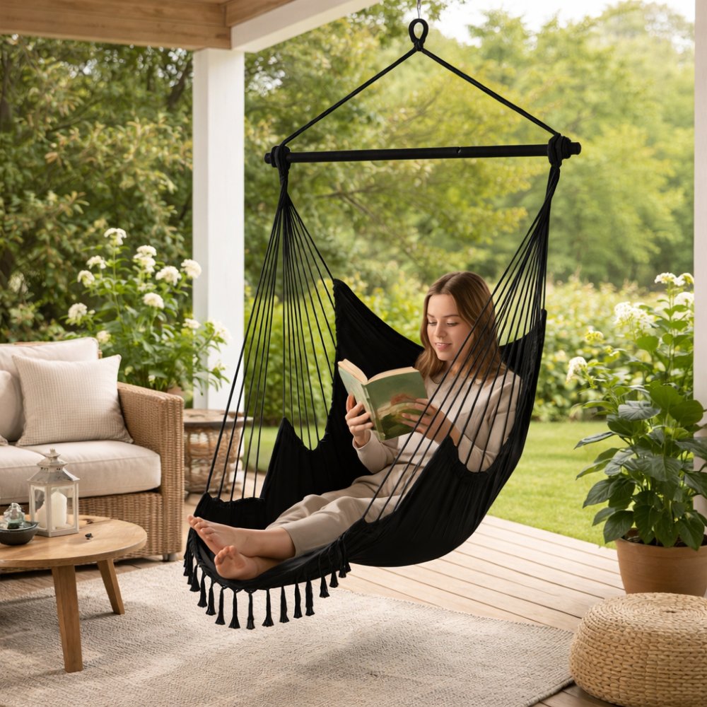 Stylové závěsné křeslo promění zahradu, terasu, balkon nebo obývací pokoj v útulnou relaxační zónu. Spojuje v sobě pohodlí houpací sítě a stabilitu křesla. Pevná, hustě tkaná bavlněná látka příjemně obepíná tělo, zatímco dva měkké polštáře zajišťují maximální pohodlí při čtení, relaxaci nebo odpoledním lenošení. Konstrukce je navržena s ohledem na bezpečnost a odolnost. Silná 6 mm silná pletená lana a kovová tyč zvyšují stabilitu a umožňují nosnost až 150 kg. Díky skládací tyči je manipulace a skladování snadné - židli lze snadno přenášet mezi interiérem i exteriérem. Materiál s gramáží 320 g/m² je odolný proti roztažení a oděru, takže vám bude sloužit po mnoho sezón. Lze ji také prát na 30 °C, což usnadňuje její údržbu. Černý design působí moderně a nadčasově, takže se hodí do minimalistických i přírodních prostor. Pokud hledáte pohodlné závěsné křeslo na zahradu nebo balkon, které nabízí styl i funkčnost v jednom. Specifikace: Barva: černá Typ: závěsné křeslo Maximální nosnost: 150 kg Celkové rozměry: 220 x 100 x 115 cm Šířka materiálu: 95 cm Počet polštářů: 2 ks (43 x 43 cm) Tloušťka lana: 6 mm Materiál sedáku: bavlna (320 g/m²) + polyester Výplň polštáře: pp bavlna Montážní prvky: pozinkovaná ocel + PP vlákno Hmotnost výrobku: 2,6 kg Pratelné: ano, 30 °C