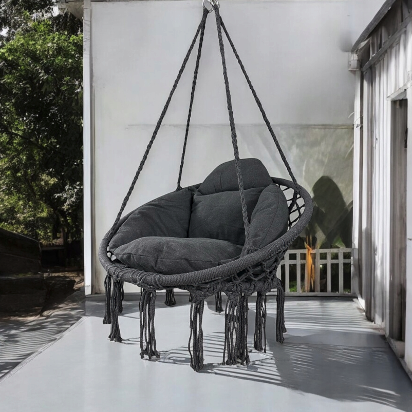 Závěsné křeslo je ideální volbou pro každého, kdo touží po pohodlném a stylovém místě k odpočinku. Je vhodný pro použití na zahradě, na balkóně, terase, ale i v interiéru - v obývacím pokoji, ložnici nebo dětském pokoji. Toto houpací křeslo poskytuje dokonalý odpočinek v pohodlné poloze a umožňuje uživateli užít si jedinečný relaxační zážitek prakticky kdekoli. Křeslo je vyrobeno z odolných a kvalitních materiálů, které zaručují dlouhou životnost a odolnost vůči povětrnostním vlivům. Silný bavlněný materiál je nejen odolný, ale také příjemný na dotek, což značně zvyšuje komfort používání. Součástí křesla jsou také velké, měkké polštáře, které poskytují ještě větší pohodlí a vytvářejí příjemné místo k odpočinku. Čapí hnízdo je skvělou volbou pro každého, kdo chce doma nebo na zahradě přidat pohodlné místo k odpočinku. Dopřejte si zasloužený odpočinek a užijte si chvíle klidu a pohodlí s tímto moderním a stylovým křeslem! Specifikace: Rozměry: zobrazeno v galerii Tloušťka ubrousku s látkou: 2,8 cm Tloušťka obroučky: 0,8 cm Maximální nosnost: 150 kg