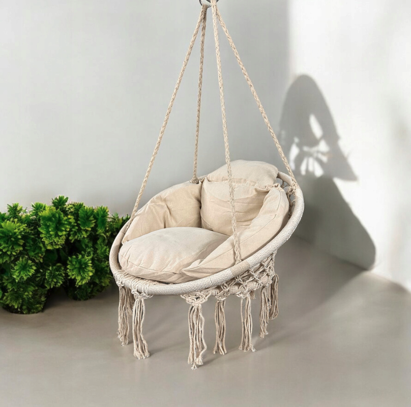 Závěsné křeslo je ideální volbou pro každého, kdo touží po pohodlném a stylovém místě k odpočinku. Je vhodný pro použití na zahradě, na balkóně, terase, ale i v interiéru - v obývacím pokoji, ložnici nebo dětském pokoji. Toto houpací křeslo poskytuje dokonalý odpočinek v pohodlné poloze a umožňuje uživateli užít si jedinečný relaxační zážitek prakticky kdekoli. Křeslo je vyrobeno z odolných a kvalitních materiálů, které zaručují dlouhou životnost a odolnost vůči povětrnostním vlivům. Silný bavlněný materiál je nejen odolný, ale také příjemný na dotek, což značně zvyšuje komfort používání. Součástí křesla jsou také velké, měkké polštáře, které poskytují ještě větší pohodlí a vytvářejí příjemné místo k odpočinku. Čapí hnízdo je skvělou volbou pro každého, kdo chce doma nebo na zahradě přidat pohodlné místo k odpočinku. Dopřejte si zasloužený odpočinek a užijte si chvíle klidu a pohodlí s tímto moderním a stylovým křeslem! Specifikace: Rozměry: zobrazeno v galerii Tloušťka ubrousku s látkou: 2,8 cm Tloušťka obroučky: 0,8 cm Maximální nosnost: 150 kg