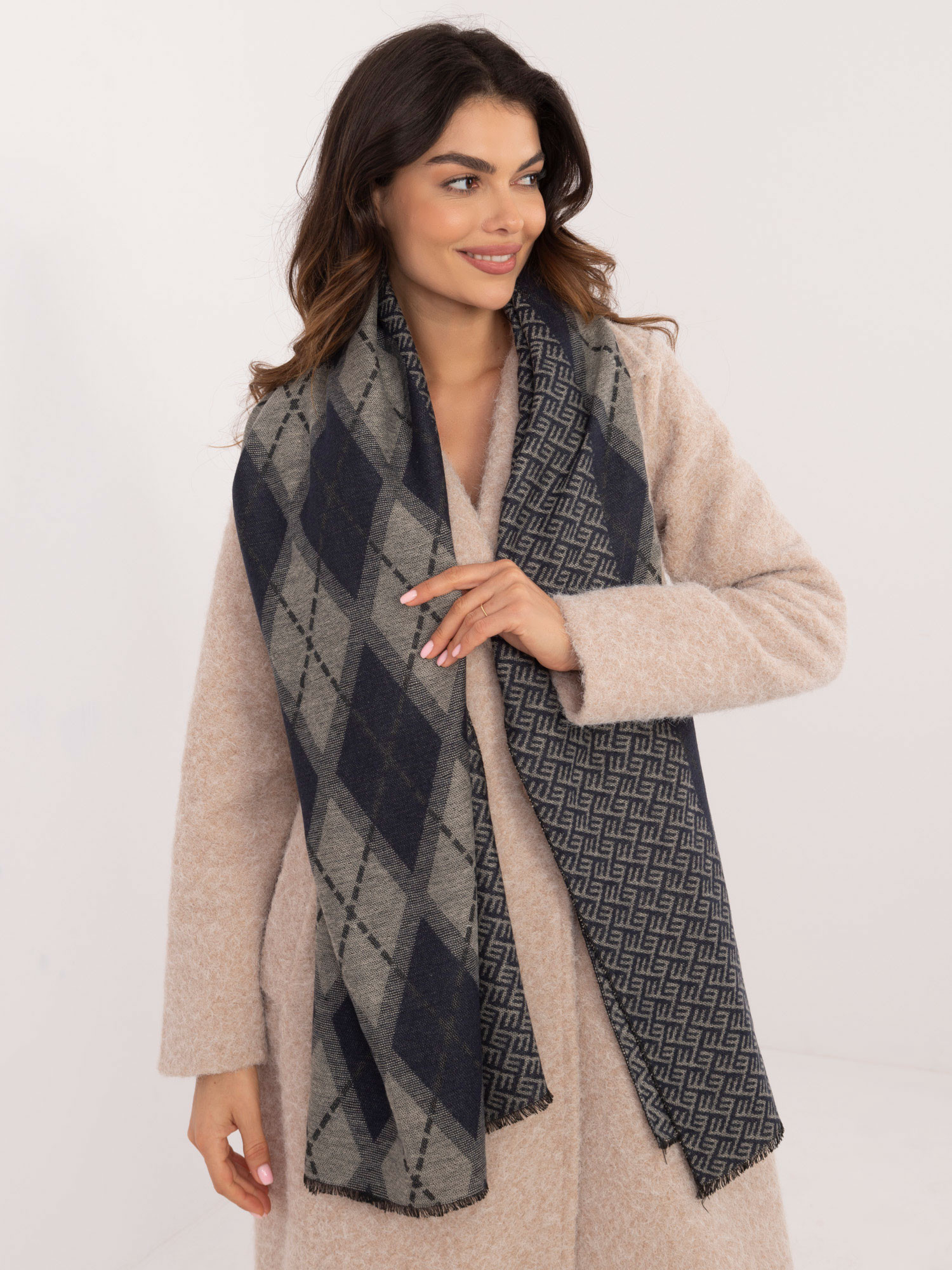Žlutý a tmavě modrý dámský šátek s třásněmi JEDNA VELIKOST