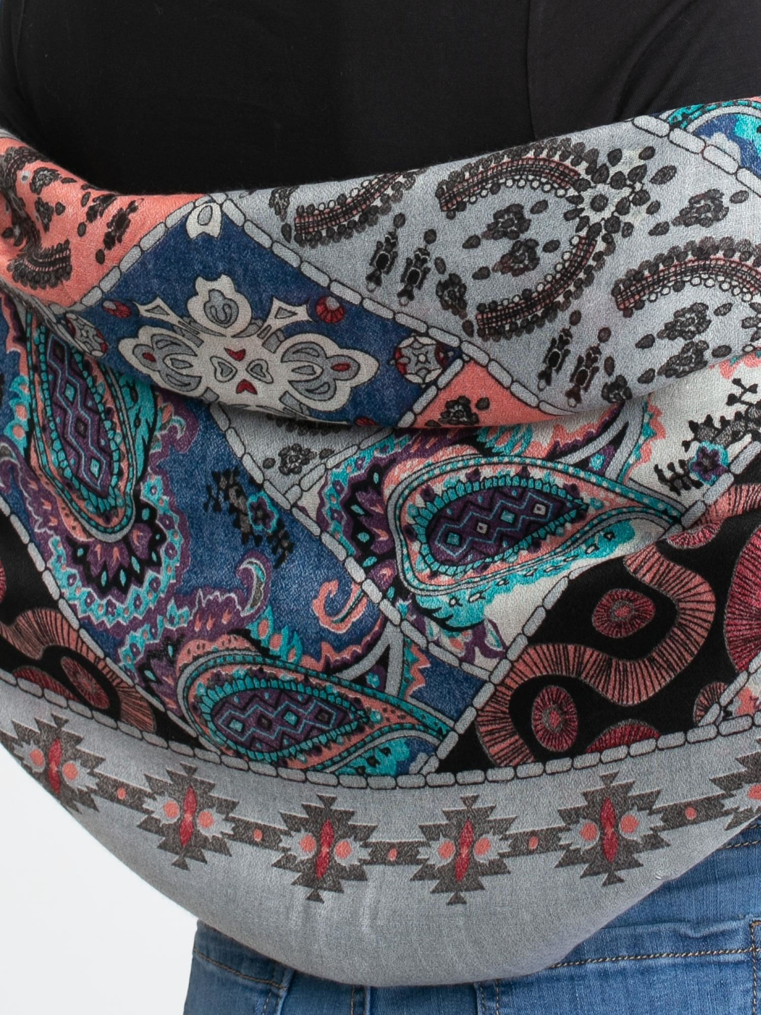 Šedý šátek s lidovým vzorem. složení látky: 100% viskóza způsob mytí: ruční mytí Rozměry: přibližně. 180 x 100 cm