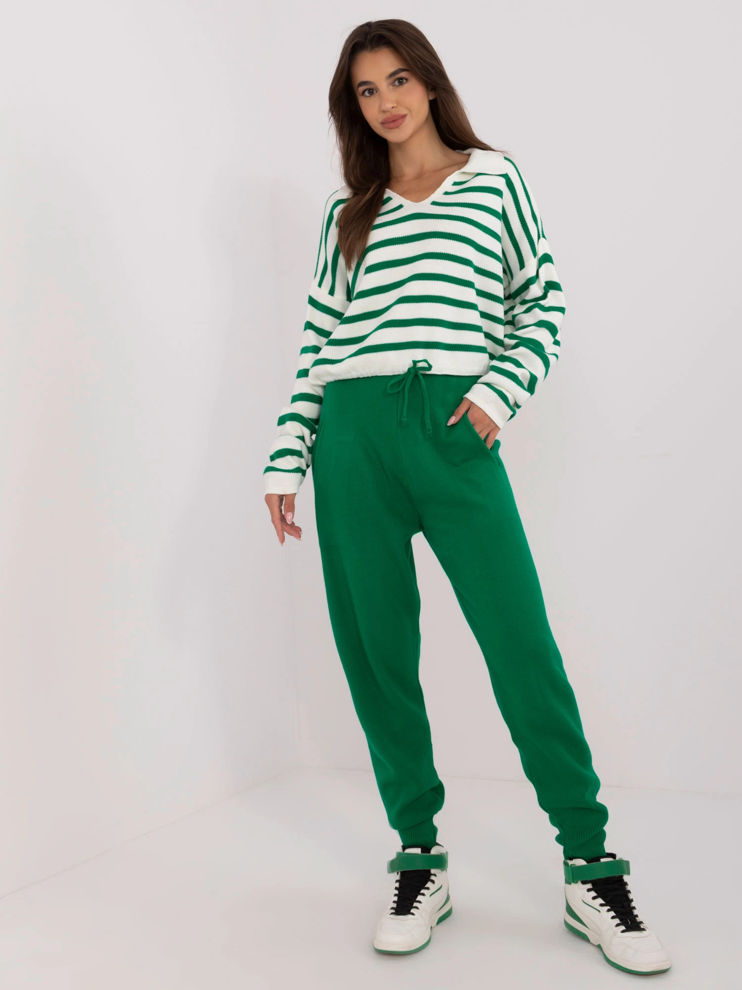 Věnujte prosím pozornost při výběru velikosti dle velikostní tabulky uvedené níže. Velikosti neodpovídají běžně nošené konfekci. Komplet, který se skládá z volného svetru a širokých dlouhých kalhot. Volný svetr Svetr má volný střih, límeček a výstřih ve tvaru písmene "V". Na spodním okraji svetru je stahující šňůrka. Model má délku do pasu. Široké dlouhé kalhoty Kalhoty jsou vyrobené z pružného materiálu a mají dvě kapsy. V pase kalhot je guma. Spodní okraj nohavic je lemovaný stahovacími lemy. Složení: 100 % akryl. Komplet padne ženám, které nosí velikost XS - M.