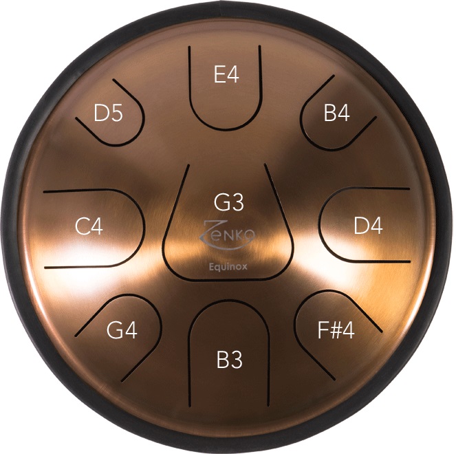 Tongue drum ZENKO ZEN04 EQUINOX Zenko je řada unikátních melodických perkusních nástrojů, které se označují jako hand pan, tongue drum nebo tank drum. Jde o výsledek dlouhého vývoje společnosti Metal Sounds ve spolupráci s předními vědci a specialisty na zpracování kovu, díky čemuž Vám tento nástroj nabídne zcela specifický zvuk. Tento nástroj je vyroben z oceli, která je speciálně tvarována a do které jsou vyřezány přesně designované jazýčky. Při úderu paličky či ruky se celý Zenko rozezní a díky své konst