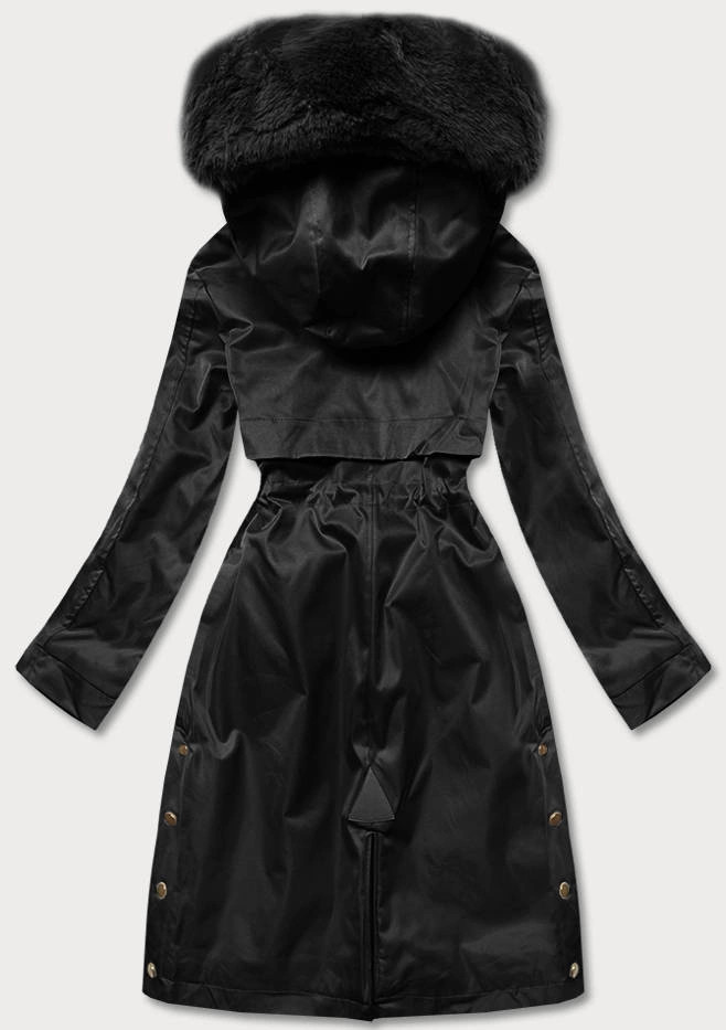 Věnujte prosím pozornost při výběru velikosti dle velikostní tabulky uvedené níže. Velikosti neodpovídají běžně nošené konfekci. Bunda s podšívkou z mechovité kožešiny Bunda je lehce vypasovaná, má dvě kapsy a zapíná se dvoustranným zipem a panelem s patentkami. Model má kapuci olemovanou kožešinou. Zatímco kapuci není možné odepnout, kožešinu lemující kapuci odepnout lze. Rukávy jsou olemované skrytými stahovacími lemy. Bundu zdobí zlaté kovové prvky. V pase modelu je stahující šňůrka. Ve spodní části bundy jsou na bocích patentky. Model má délku nad kolena. Složení: 100 % polyester.
