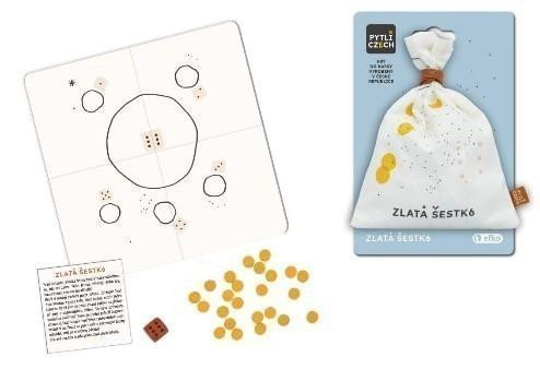 Oddychová hra, ve které vyhrává ten, kdo se jako první zbaví všech svých žetonů.. Herní plán, dřevěné žetony a hrací kostka v designovém textilním pytlíku potěší nejednoho cestovatele a milovníka jednoduchých deskových her. Vyrobeno v České republice. Hledáte zábavnou oddychovou hru, kterou si můžete zahrát na výletě nebo jen tak pro zábavu doma? Naše provedení Zlaté šestky potěší všechny milovníky minimalismu a krásný věcí. Žádné složité návody, ale pravidla, která pochopí i děti. Hra je určena pro 2-8 osob. Tuhle hru vyhraje ten, kdo se jako první zbaví všech svých žetonů. Je jen na vás, zda využijete herní plán natištěný přímo na zadní straně pytlíčku nebo raději zvolíte ten kartonový, který naleznete uvnitř spolu s dřevěnou kostku, dřevěnými žetony a návodem. Bavlněný pytlík s praktickou gumičkou je potištěn ilustrací hvězd cestovatelky a designérky Táni Sekerkové. … a jaký příběh se za touto ilustrací plnou hvězd skrývá? Jsme v Chile. Sjeli jsme z hlavní silnice a o několik set metrů dál jsme našli nádherné místo na spaní. Je docela teplo, a tak jsme se rozhodli, že nebudeme stavět stan, ale zkusíme se vyspat na korbě auta. Začíná se stmívat a k tomu ochlazovat, ale to, co se děje nad námi, to se nedá popsat. První hvězda a tady druhá, třetí… Na obloze je víc hvězd než tmy. To je mléčná dráha? Páni! Obsahuje: designový bavlněný pytlík s praktickou gumičkou na uzavírání 24 dřevěných žetonů 10x4 mm dřevěnou kostku pevný skládací kartonový herní plán 180x180 mm návod