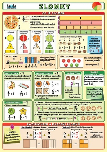 <p>Přehledně zpracované a bohatě ilustrované téma zlomků. Obsahuje základní rozdělení zlomků, rozšiřování a krácení zlomků, porovnávání zlomků a matematické operace se zlomky.</p>
