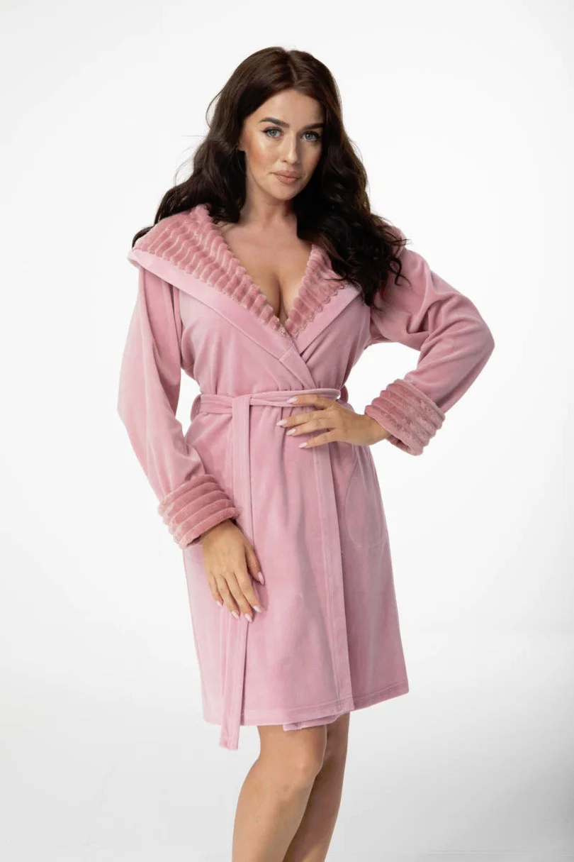 Dámský župan s kapucí, vázaný v pase. Složení: 80 % bavlna, 20 % polyester