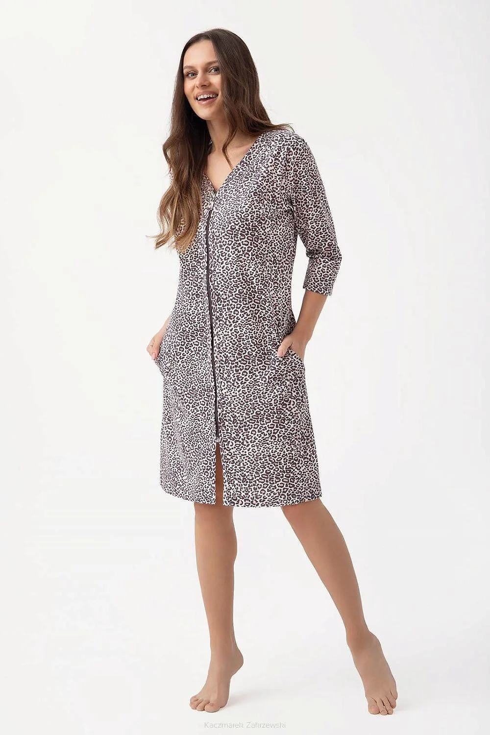 Dámský bavlněný župan -leopardí nebo květinový potisk - délka rukávu 7/8 - zapínání na zip - výstřih ve tvaru V - pohodlné kapsy na úrovni boků Složení: 100% bavlna