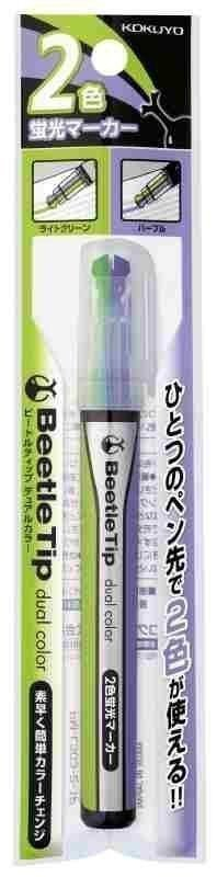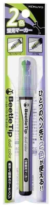 Zvýrazňovač KOKUYO se speciálním dvojitým hrotem - jeden popisovač se dvěma barvami ve zdvojeném hrotu, dle držení popisovače zvýrazňování zeleným odstínem, pootočením o 180 stupňů k dispozici fialový odstín, příjemné držení plastového těla popisovače, šetří místo v penále i na stole, provedení s víčkem.