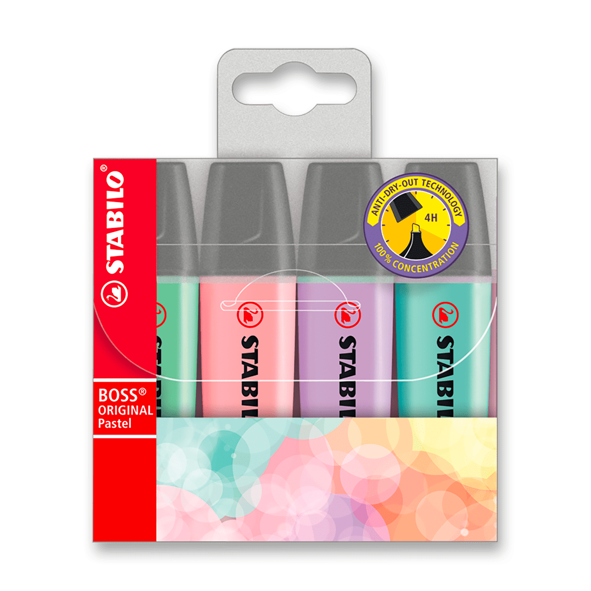 Sada 4 barev klasického zvýrazňovače Stabilo Boss v pastelových barvách. Díky technologii Anti-Dry-Out vydrží až 4 hodiny otevřený bez vyschnutí. Plastové tělo zvýrazňovače je v barvě inkoustu. Inkoust na vodní bázi, nerozmazává text. Jedinečný zvýrazňovač, který dobře padne do ruky. Klínový hrot, šíře stopy 2 nebo 5 mm. inkoust na vodní bázi vysoká životnost Stabilo Anti-Dry-Out Technologie: vydrží až 4 hodiny bez vyschnutí, pro lepší koncentraci během práce vhodný pro papír, kopie i faxy ideální pro designové projekty, hand-lettering a poznámkové bloky seříznutý hrot, šíře stopy 2 nebo 5 mm V nabídce máme i jednotlivé barvy., Neporovnatelná designová klasika už od roku 1971! Zakupte produkt Zvýrazňovače Stabilo Boss Original - sada Pastel, 4 barvy z kategorie Psací potřeby | Zvýrazňovače | Sady od výrobce Stabilo za cenu 144 Kč.