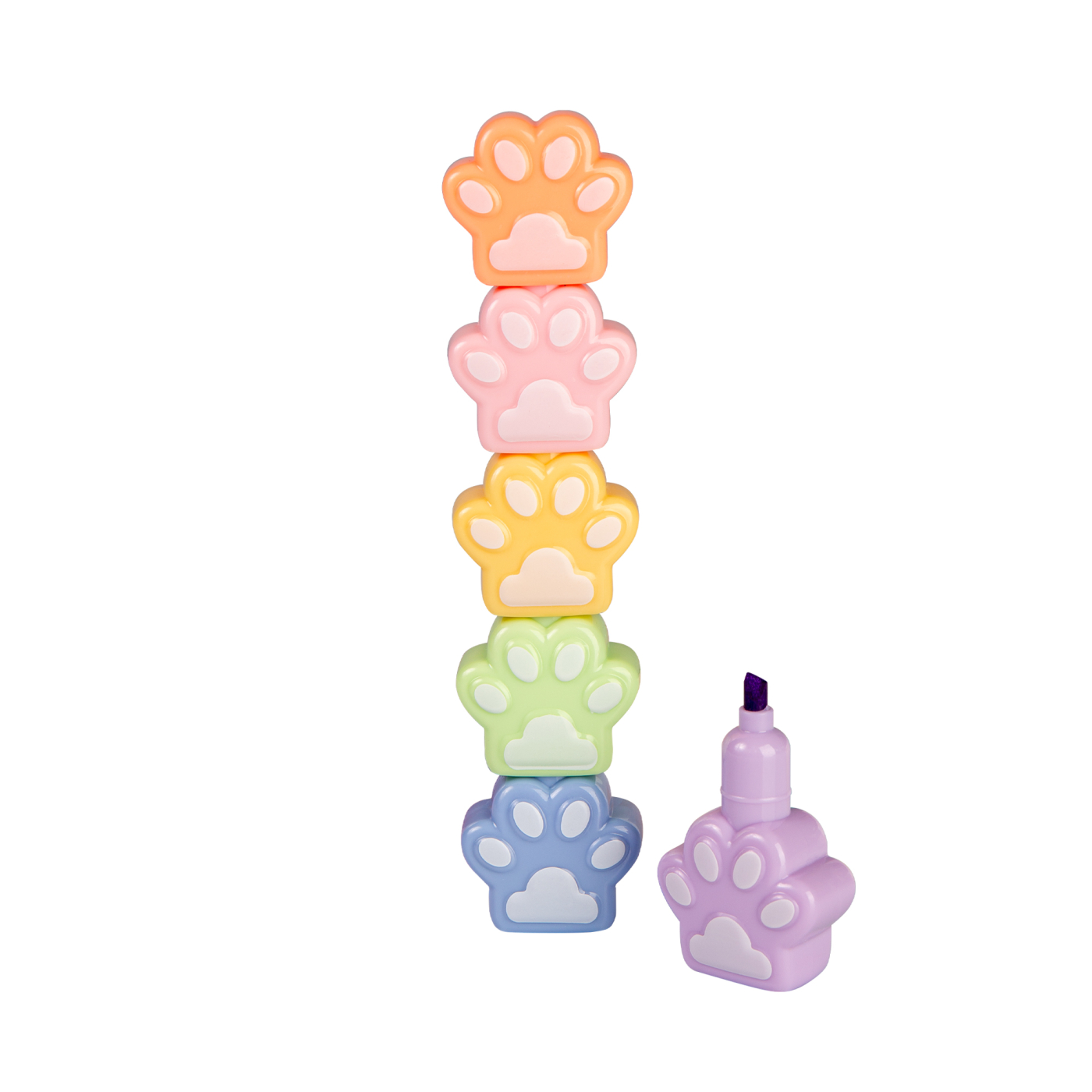 Sada obsahuje 5 kusů zvýrazňovačů (fialový, růžový, žlutý, zelený a modrý) ve tvaru tlapiček.